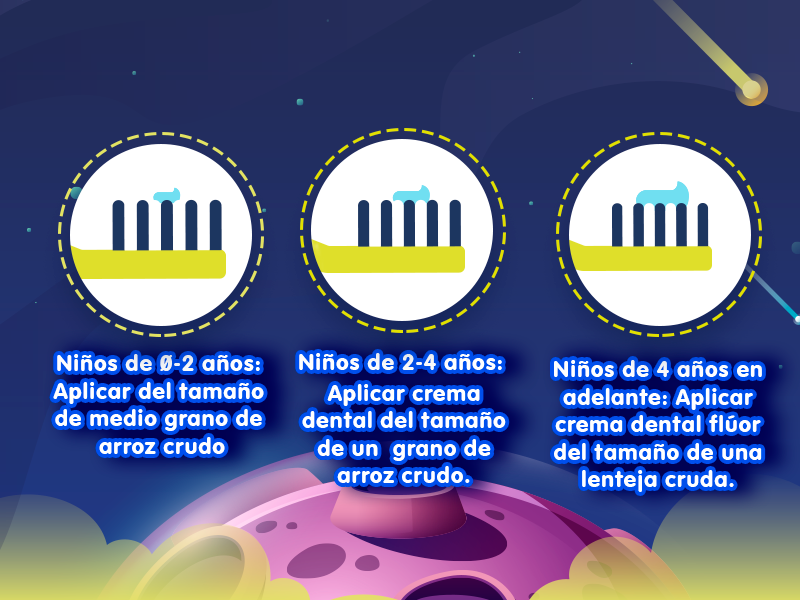 Niños de 0-2 años: Aplicar crema dental con flúor de 1100 ppm del tamaño de medio grano de arroz crudo.